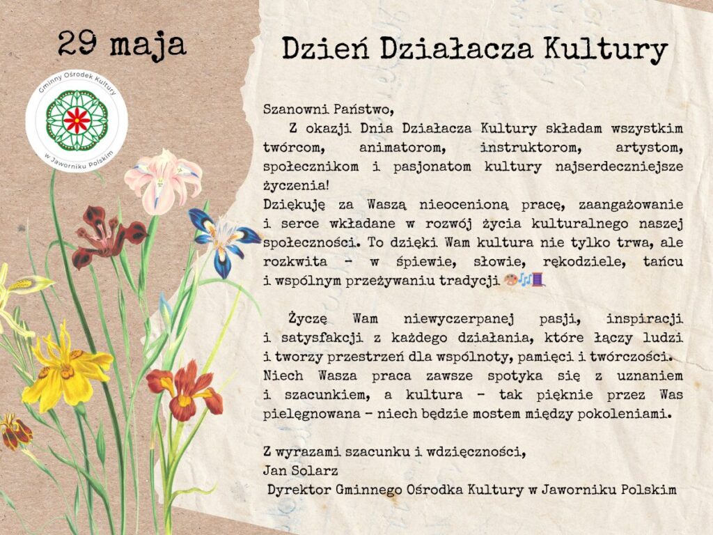Z okazji Dnia Działacza Kultury, Gminny Ośrodek Kultury w Jaworniku Polskim pragnie złożyć najserdeczniejsze życzenia wszystkim osobom, które swoją codzienną działalnością budują i rozwijają życie kulturalne naszej gminy i regionu.