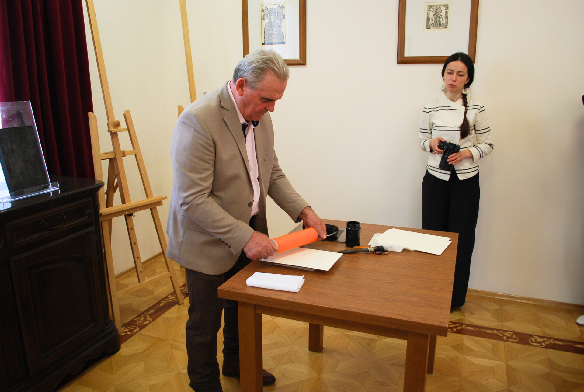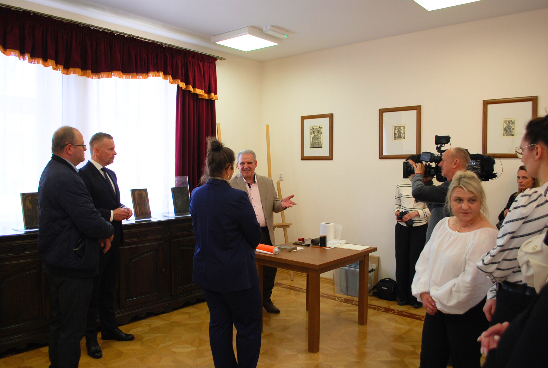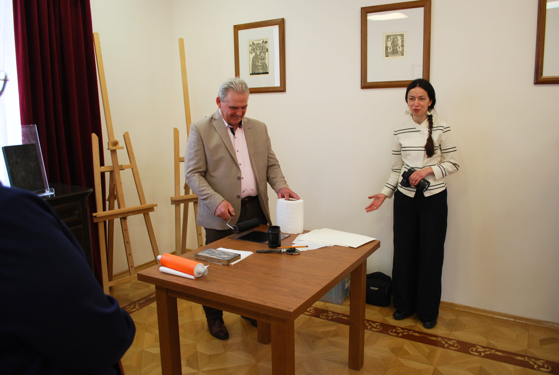 Po części oficjalnej uczestnicy mieli okazję swobodnie zwiedzać ekspozycję, a także zobaczyć z bliska wykonanie odbitek przez samego artystę, który chętnie opowiedział o procesie twórczym, narzędziach oraz historii poszczególnych prac, co nadało wydarzeniu kameralny, niemal warsztatowy charakter.