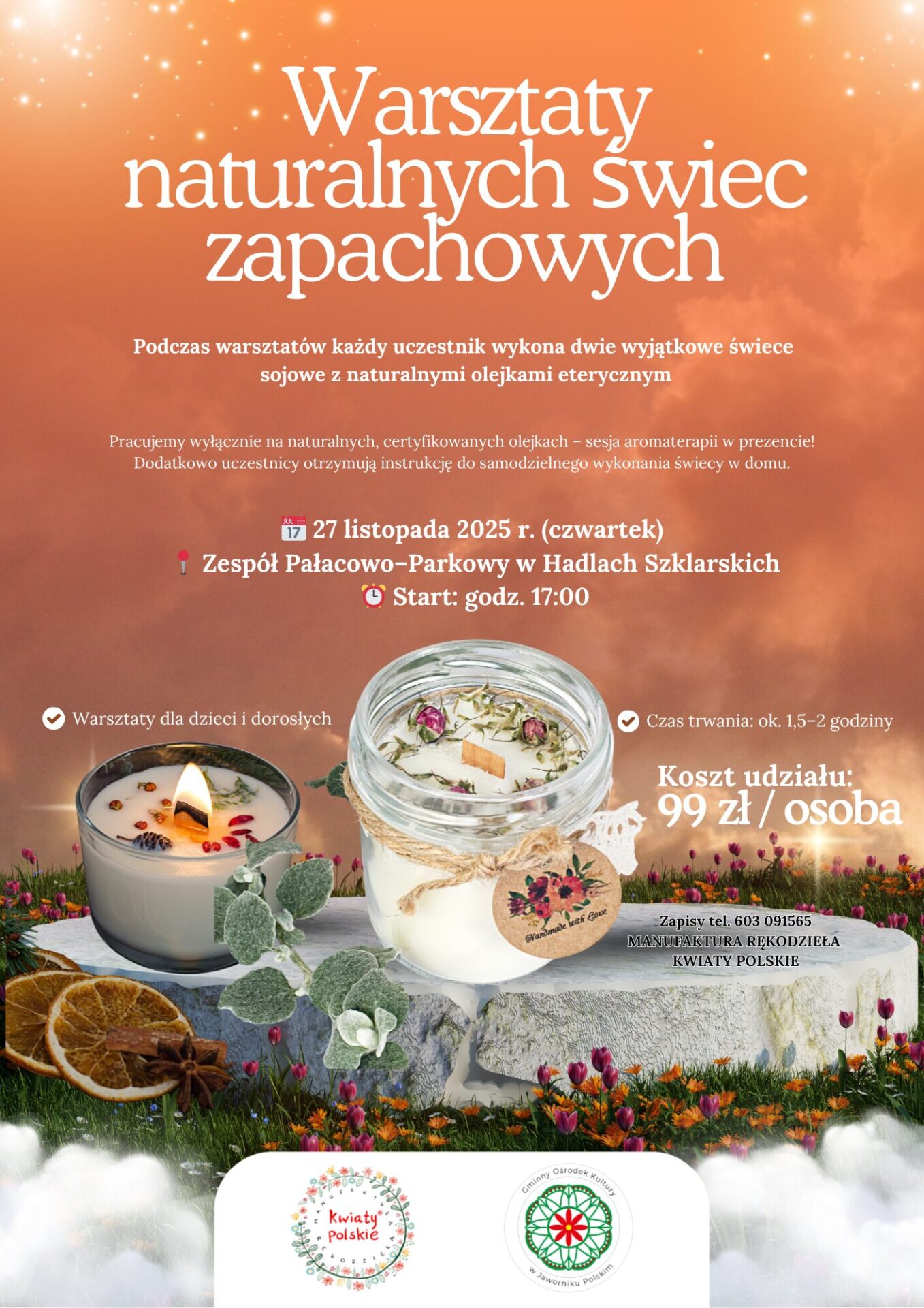 Już 27 listopada 2025 r. (czwartek) o godz. 17:00 w klimatycznym wnętrzu Zespołu Pałacowo–Parkowego w Hadlach Szklarskich odbędą się wyjątkowe Warsztaty Naturalnych Świec Zapachowych